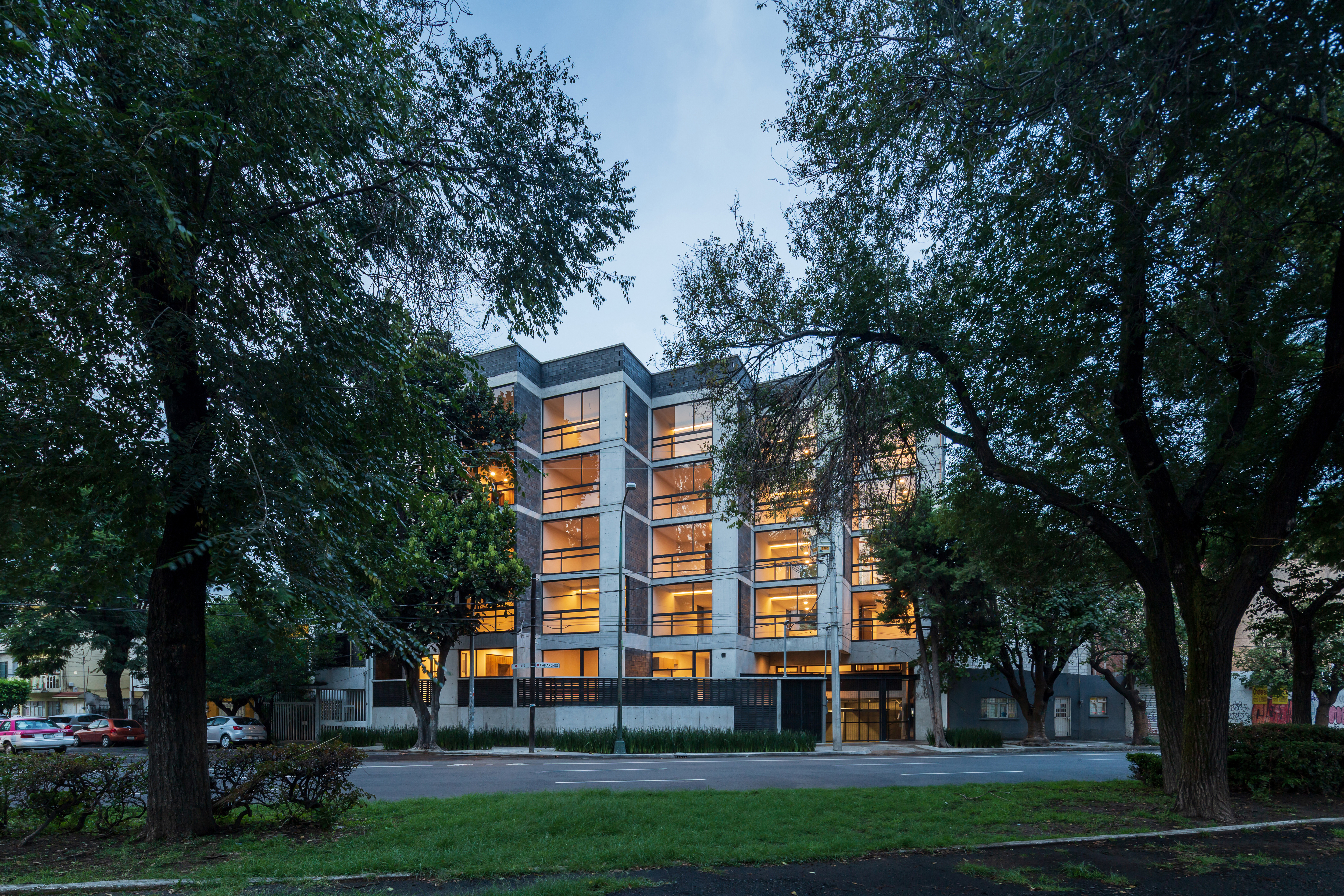 El edificio de 14 departamentos contiene tres diferentes tipos de unidades que se organizan en torno a un núcleo de circulaciones mínimo para ampliar las áreas habitables; dos en la planta baja de 82-92 m² con terraza frontal y jardín posterior, cuatro de 65 m² en cada nivel en la esquina sur del edificio y ocho departamentos de dos niveles y área de 79-93 m² en el 2º y 5º nivel. Estos departamentos siguen un esquema alterno donde los del 2º nivel suben a las recámaras en el 3º y los del 5º nivel bajan a las recámaras en el 4º. Esta estrategia permite que todos los departamentos cuenten con iluminación y ventilación cruzada hacia el frente y al patio posterior del edificio.