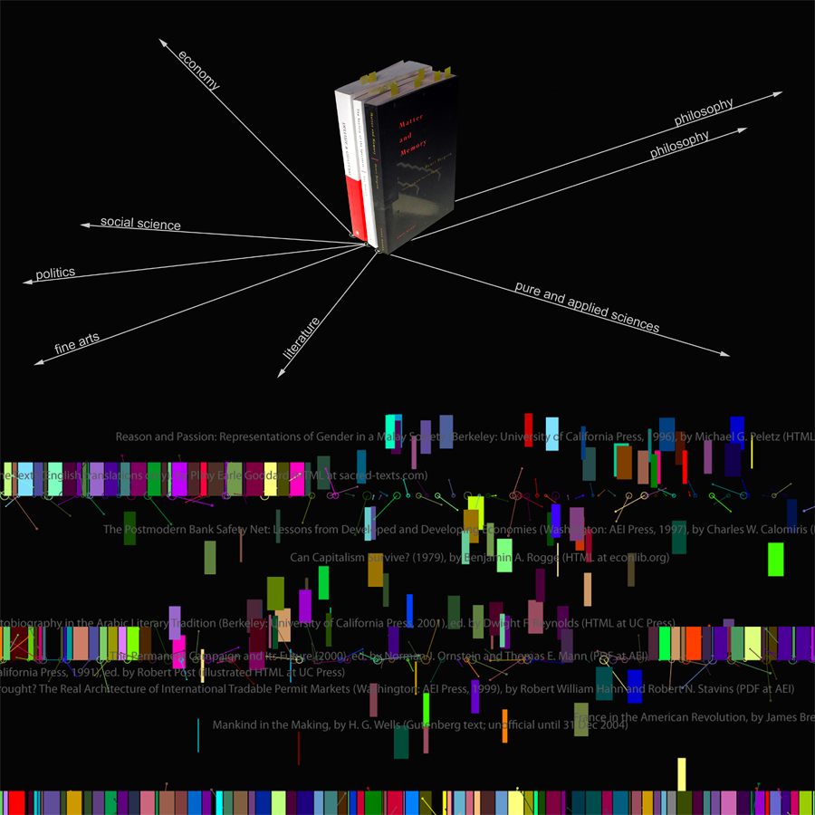 Some books have transformed these relationships by linking diverse themes and establishing direct connections between them, carving specific tunnels that connect areas of knowledge. The whole library is a single surface-membrane transformed by the vectors, carving spaces as carving knowledge itself.